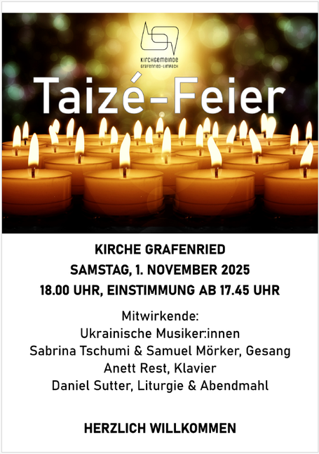 In der Kirche Grafenried findet jeweils in den Monaten November, Dezember, Januar und Februar pro Monat ein Taizé-Gottesdienst statt.